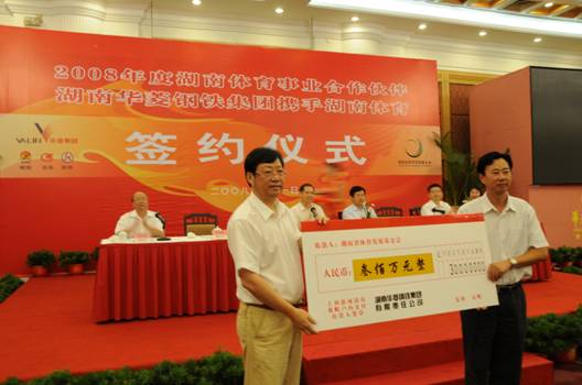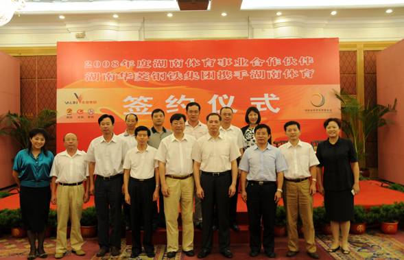 2008年8月1日,湖南華菱鋼鐵集團(tuán)與湖南省體育局在華天大酒店舉行簽約儀式,華菱集團(tuán)成為2008年度湖南體育事業(yè)合作伙伴。華菱集團(tuán)向省體育發(fā)展基金捐款300萬元。副省長郭開朗參加簽約儀式