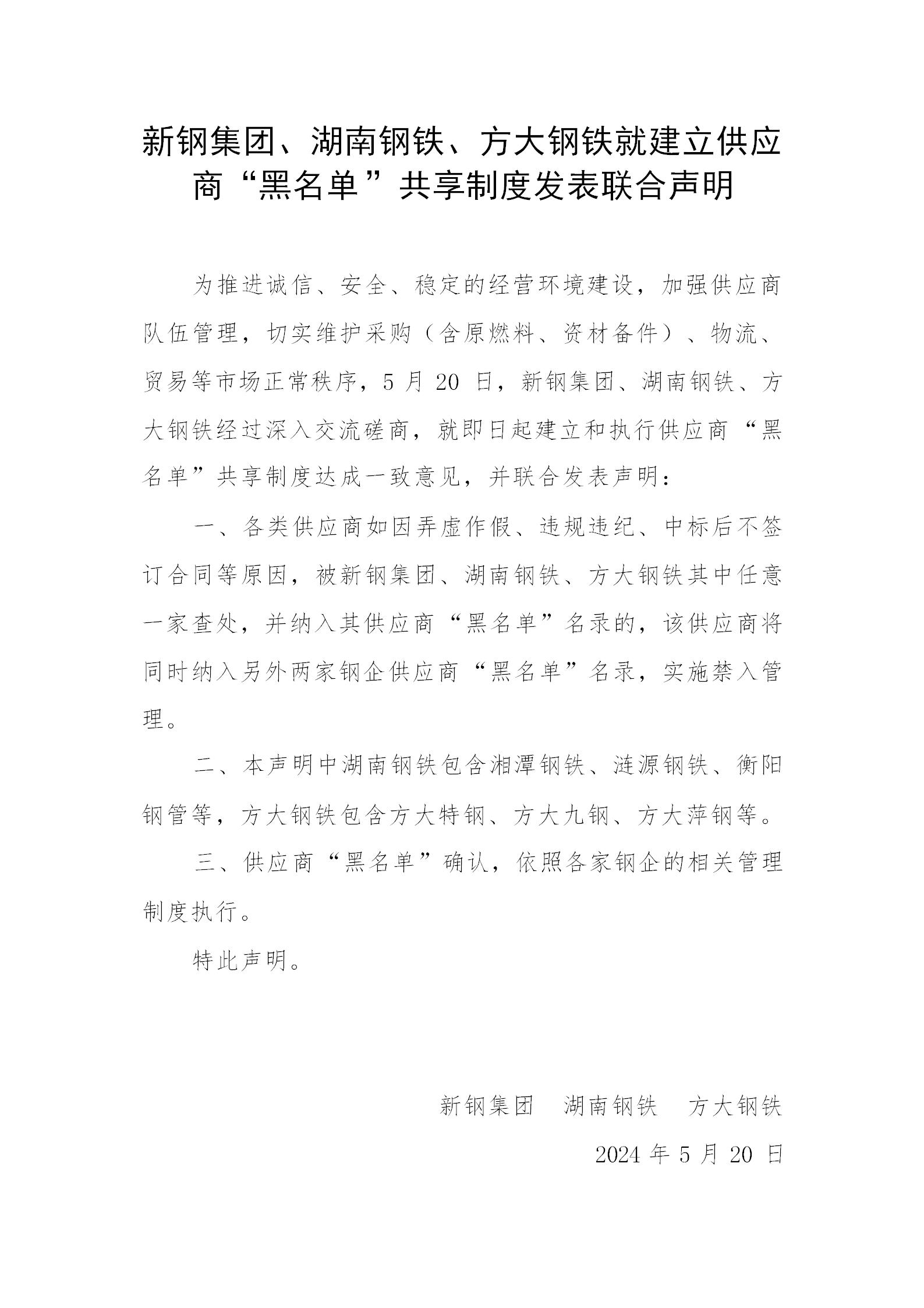 新鋼集團(tuán)、湖南鋼鐵、方大鋼鐵就建立供應(yīng)商“黑名單”共享制度發(fā)表聯(lián)合聲明