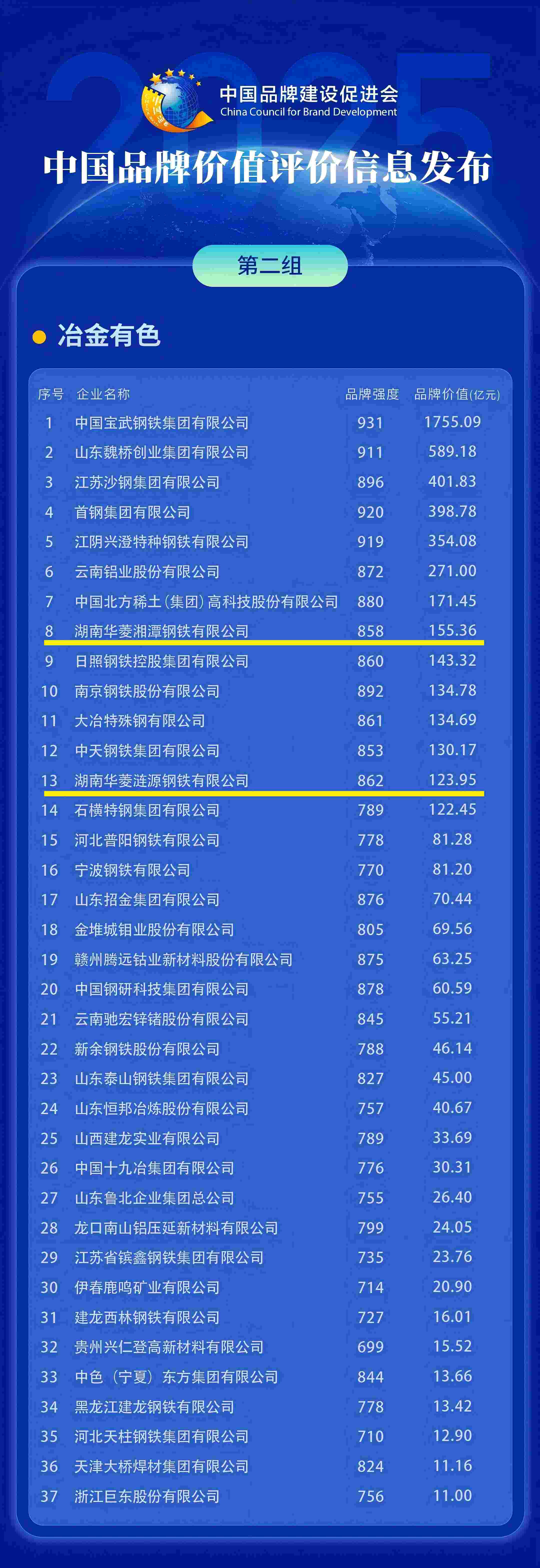湖南鋼鐵集團核心企業(yè)湘鋼以858的品牌強度、155.36億元品牌價值位居冶金有色品牌榜第8位,漣鋼以862的品牌強度、123.95億元品牌價值位列冶金有色品牌榜第13位。