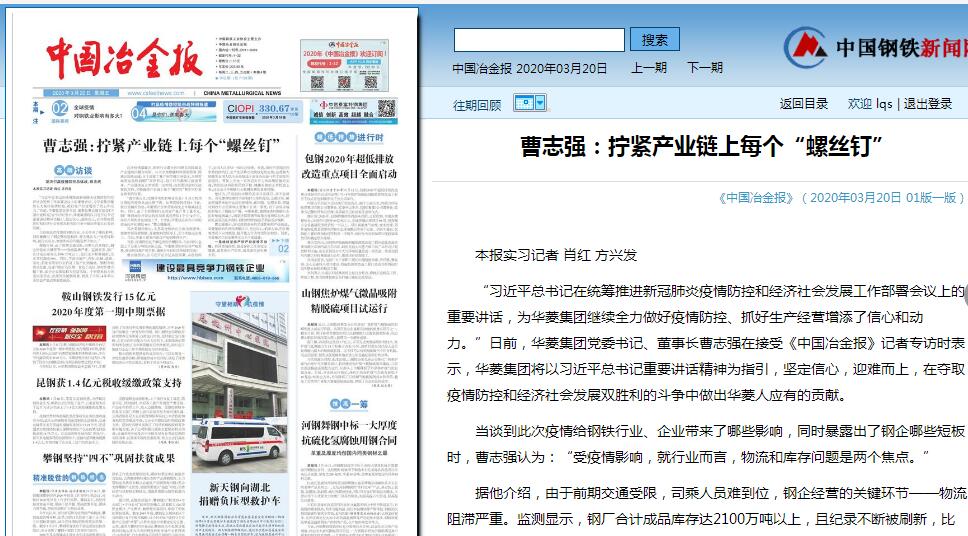 “習(xí)近平總書記在統(tǒng)籌推進新冠肺炎疫情防控和經(jīng)濟社會發(fā)展工作部署會議上的重要講話,為華菱集團繼續(xù)全力做好疫情防控、抓好生產(chǎn)經(jīng)營增添了信心和動力。”日前,華菱集團黨委書記、董事長曹志強在接受《中國冶金報》記者專訪時表示,華菱集團將以習(xí)近平總書記重要講話精神為指引,堅定信心,迎難而上,在奪取疫情防控和經(jīng)濟社會發(fā)展雙勝利的斗爭中做出華菱人應(yīng)有的貢獻。