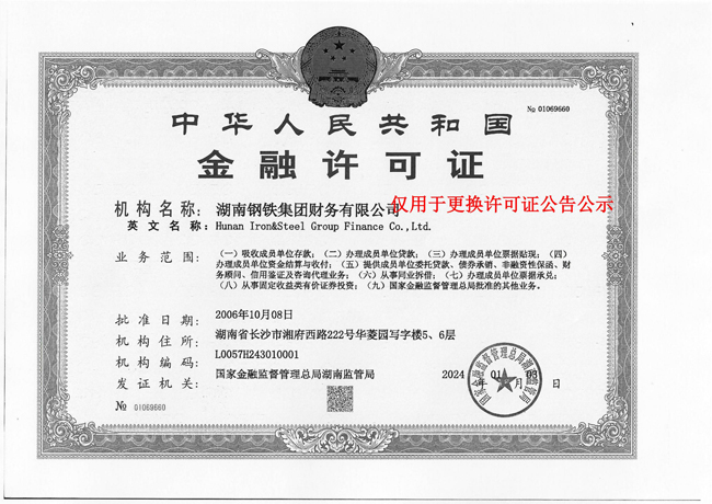 集團下屬財務公司《公司章程》變更事項已于2023年12月26日獲得國家金融監(jiān)督管理總局湖南監(jiān)管局核準批復,已于2024年1月3日完成更換金融許可證、1月9日完成工商變更備案,現(xiàn)予以公告。