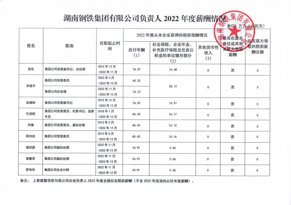 湖南鋼鐵集團(tuán)有限公司負(fù)責(zé)人2022年度薪酬信息披露