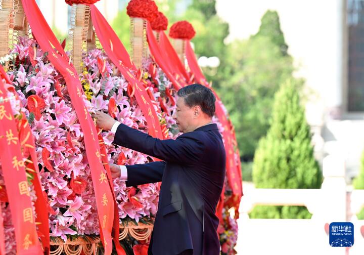 9月30日上午,黨和國家領(lǐng)導人習近平、李強、趙樂際、王滬寧、蔡奇、丁薛祥、李希、韓正等來到北京天安門廣場,出席烈士紀念日向人民英雄敬獻花籃儀式。這是習近平整理花籃上的緞帶。新華社記者 殷博古 攝