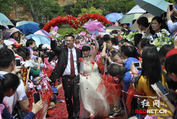 (5月12日,華菱漣鋼參與集體婚禮的新人們穿越愛(ài)的拱門,伴隨著愛(ài)的宣言,踏上通往婚姻殿堂的紅地毯。)
