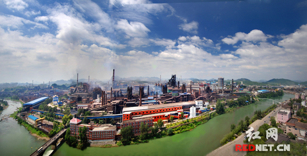 站在漣鋼雙菱大廈樓頂看漣鋼,別有一番風(fēng)景。近處,林立的高爐爐頂吐出的一團(tuán)團(tuán)白色水蒸氣在藍(lán)色的天空下慢慢飄散,成為一團(tuán)飛舞的云彩;高爐下面,作為湘江支流的漣水河碧波蕩漾,河岸綠樹(shù)成蔭,漣鋼大橋車水馬龍,一派繁忙;遠(yuǎn)處,鐵紅色的現(xiàn)代化工廠廠房鱗次櫛比,一抹抹綠色與各種管道、皮帶通廊等大型設(shè)備和諧交織。