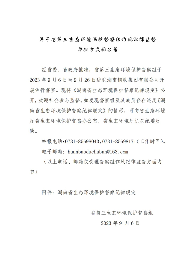 第二輪省生態(tài)環(huán)境保護督察組例行督察湖南鋼鐵集團進駐信息公告、關于省第三生態(tài)環(huán)境保護督察組作風紀律監(jiān)督舉報方式的公告