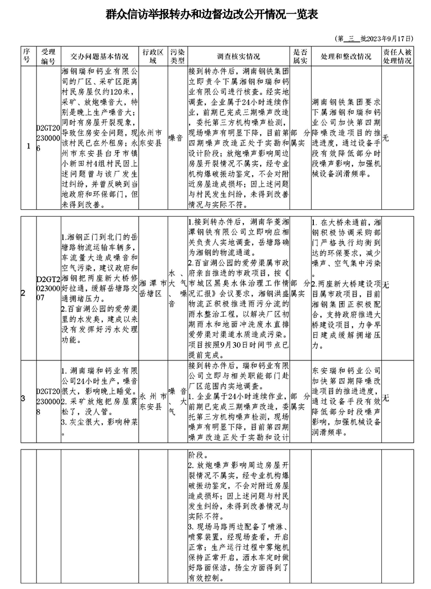 湖南鋼鐵集團進行督查督辦,調查核實,要求子公司對不屬實部分進行說明、對屬實問題立整立改。現將第三批信訪舉報轉辦件辦理情況公示如下: