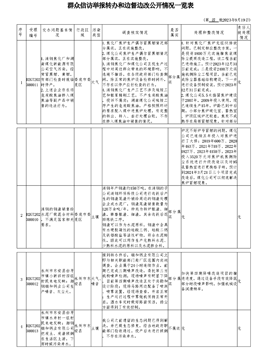 湖南鋼鐵集團(tuán)進(jìn)行督查督辦,調(diào)查核實(shí),要求子公司對(duì)不屬實(shí)部分進(jìn)行說明、對(duì)屬實(shí)問題立整立改?,F(xiàn)將第四批信訪舉報(bào)轉(zhuǎn)辦件辦理情況公示如下: