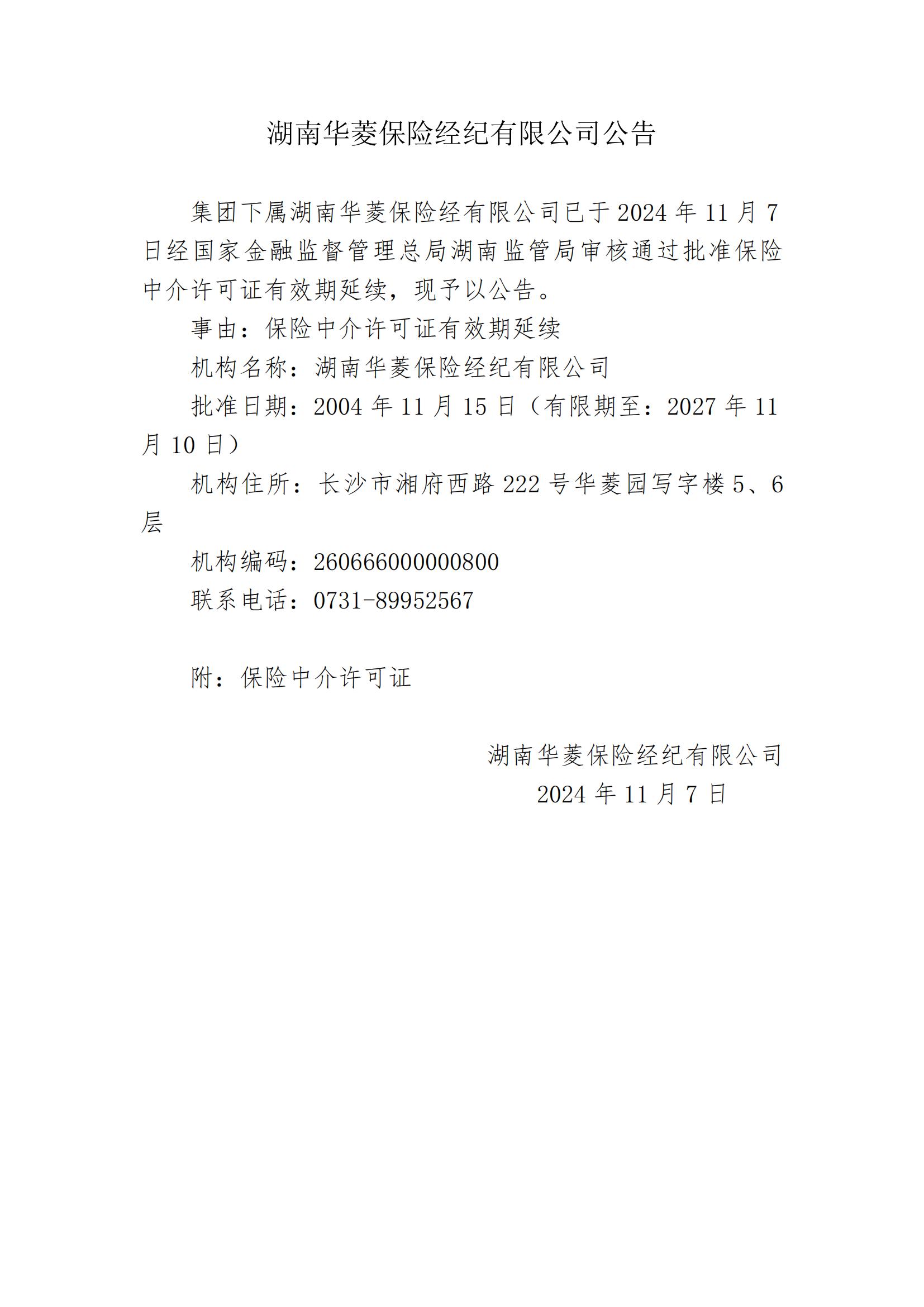 湖南華菱保險(xiǎn)經(jīng)紀(jì)許可證有延期公告